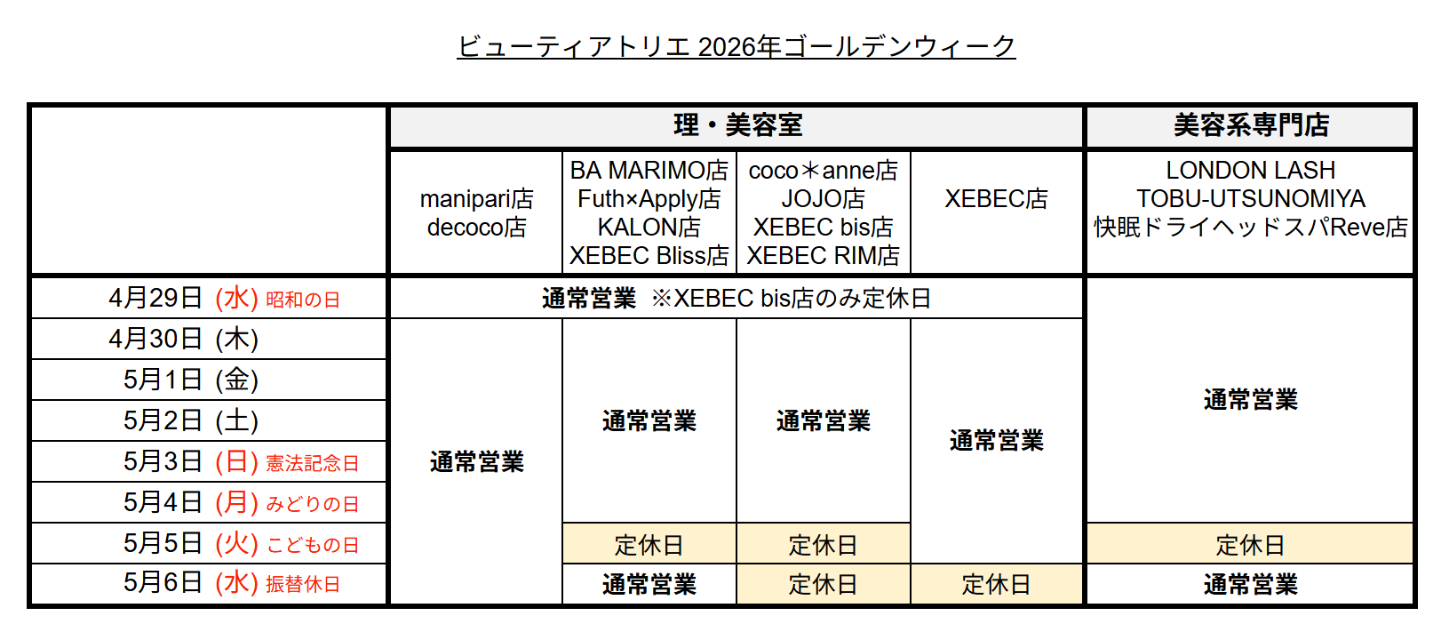 ビューティアトリエ【2026年ゴールデンウィーク期間の営業スケジュール】につきまして、